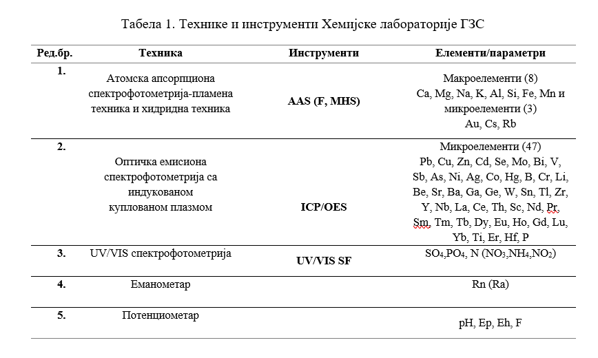 Садржај макро и микроелемената одређује се употребом класичних аналитичких метода (гравиметријске и волуметријске), као и инструменталних техника (AAS, ICP/OES, UV/VIS SF). На тај начин може одредити садржај за око 60 елемената Периодног система (Табела 1.)